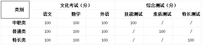 (1)文化考試試題由省統(tǒng)一命制,試題分普通高中類(lèi)和中職類(lèi),考試科目均為語(yǔ)文100分,數(shù)學(xué)100分,英語(yǔ)100分,三科分卷,總分300分。