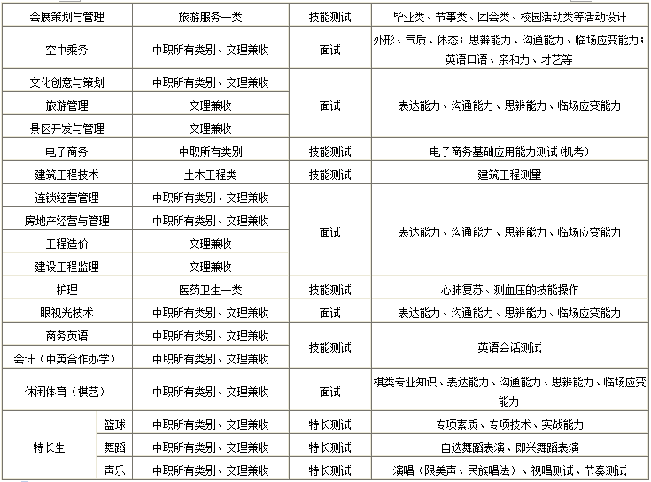 成都職業(yè)技術(shù)學(xué)院2019年單獨(dú)招生考試采用“文化考試+綜合測試”方式進(jìn)行,考試總分300分。每位考生均需參加文化考試,同時(shí),根據(jù)不同招生專業(yè)與考生類別,每位考生還需參加專業(yè)技能測試、面試、特長生專項(xiàng)測試中的一項(xiàng)綜合測試(見下表1)。