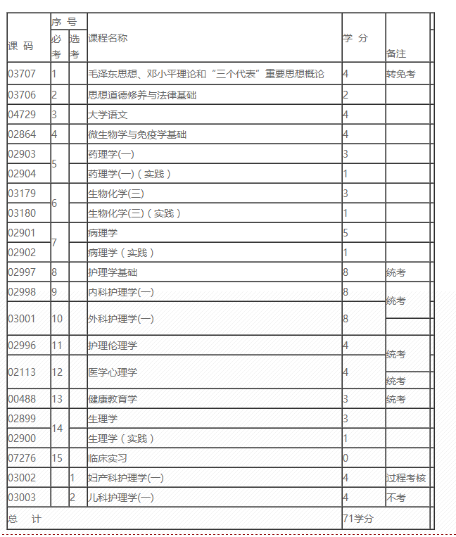 四川大學(xué)自考護(hù)理專業(yè)具有中職學(xué)歷護(hù)理專業(yè)的畢業(yè)生參加考試。有15門科目,全部合格并完成畢業(yè)設(shè)計(jì)可獲的四川大學(xué)頒發(fā)的大專畢業(yè)證書,國家承認(rèn)學(xué)歷。考試科目主要有大學(xué)語文、微生物學(xué)與免疫學(xué)基礎(chǔ)、藥理學(xué)等科目,畢業(yè)即可到各大醫(yī)院工作